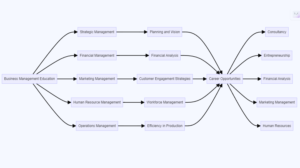 This diagram illustrates the journey from acquiring foundational knowledge in business management to its practical application in various career paths. It underscores the interconnection of different subjects, highlighting the comprehensive nature of the curriculum.