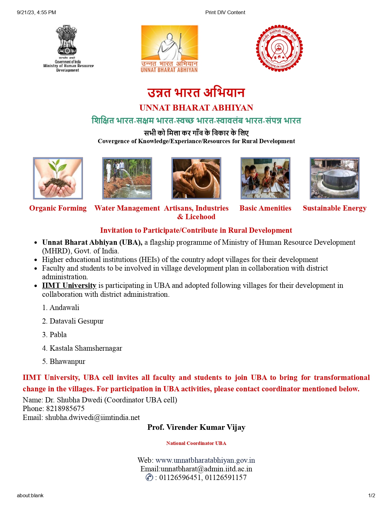 Unnat Bharat Abhiyan cell is motivated by the vision of transformational changes in rural growth and expansion by connecting and utilizing the potential of IIMT University to rural areas to help, build & restructure and help towards the growth of India.